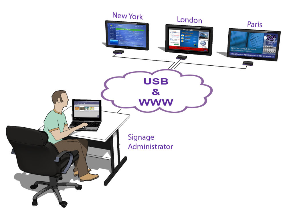 Our software uses the power of the internet to deliver content anywhere in the world. Connect your display directly to the network or via the Internet. Once the content has been delivered, the Internet connection is no longer needed unless you are using live feeds.