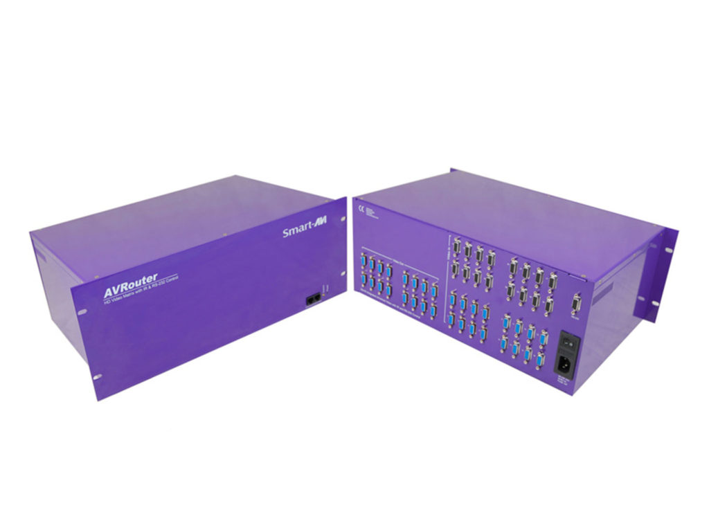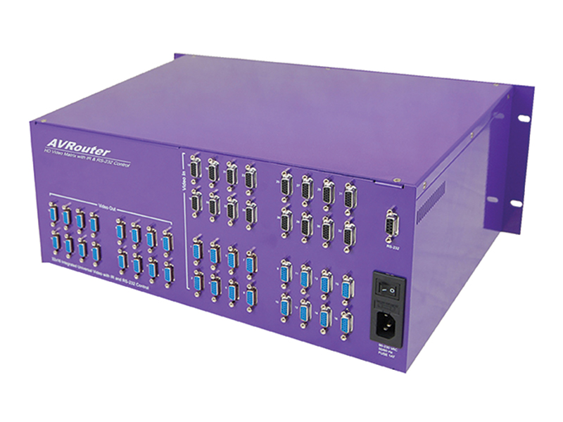 The AVRouter is a high-quality switching matrix for video signals. Signal formats include VGA, SVGA, XGA and UXGA. Standard VGA connectors (HD15 sockets) are used on the rear for ease of installation for video connectivity and RCAs for computers