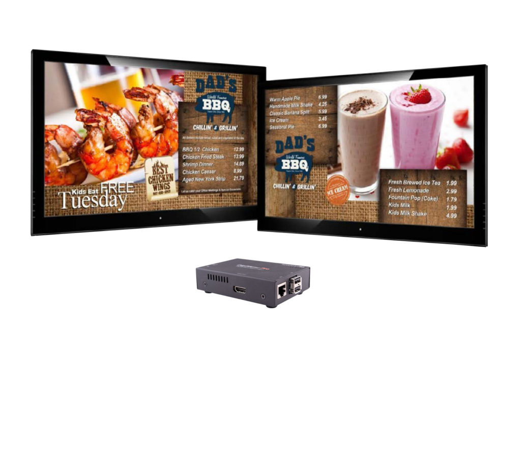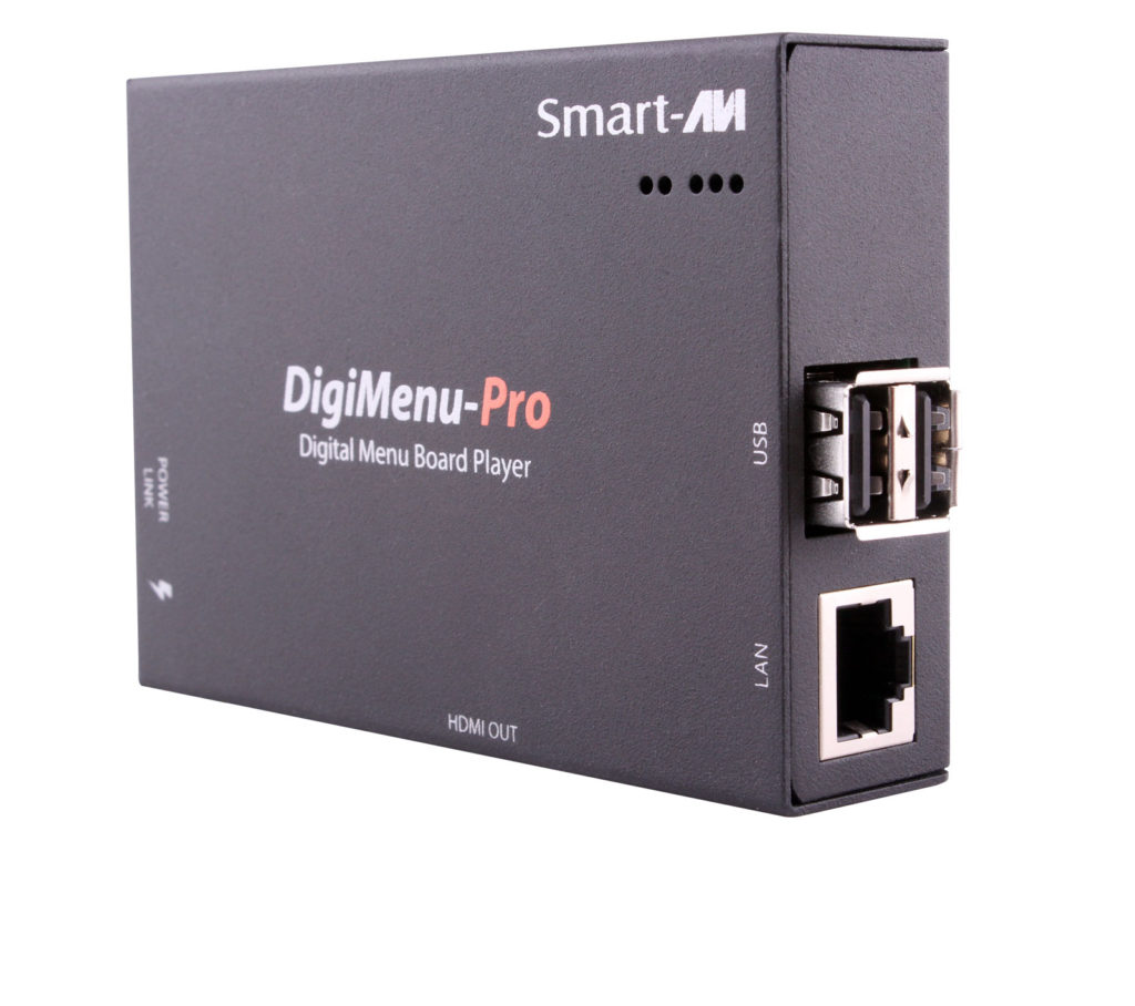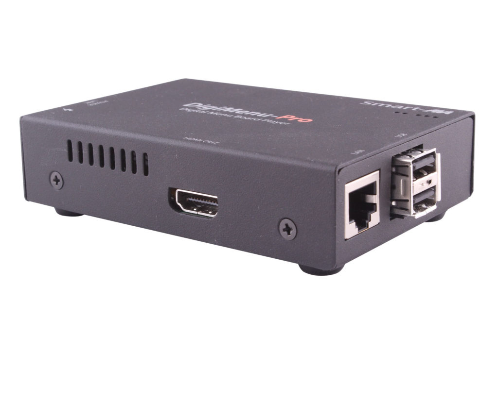 The DigiMenu-Pro is a digital signage player that allows users to easily create, manage, and schedule amazing digital menu boards. Perfect for restaurants, coffee shops, food trucks, fast food restaurants, and many other applications.