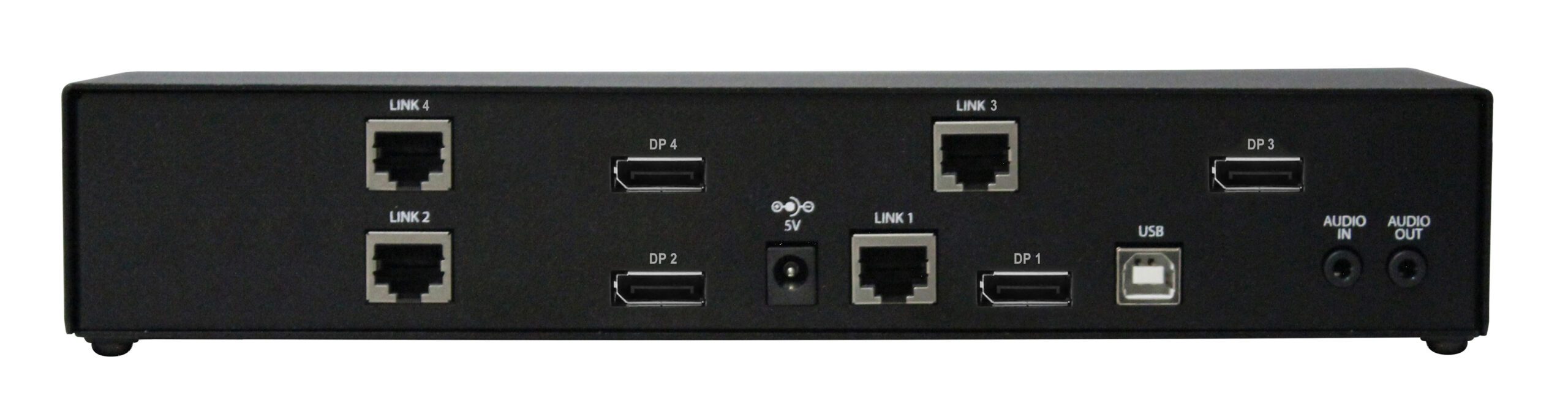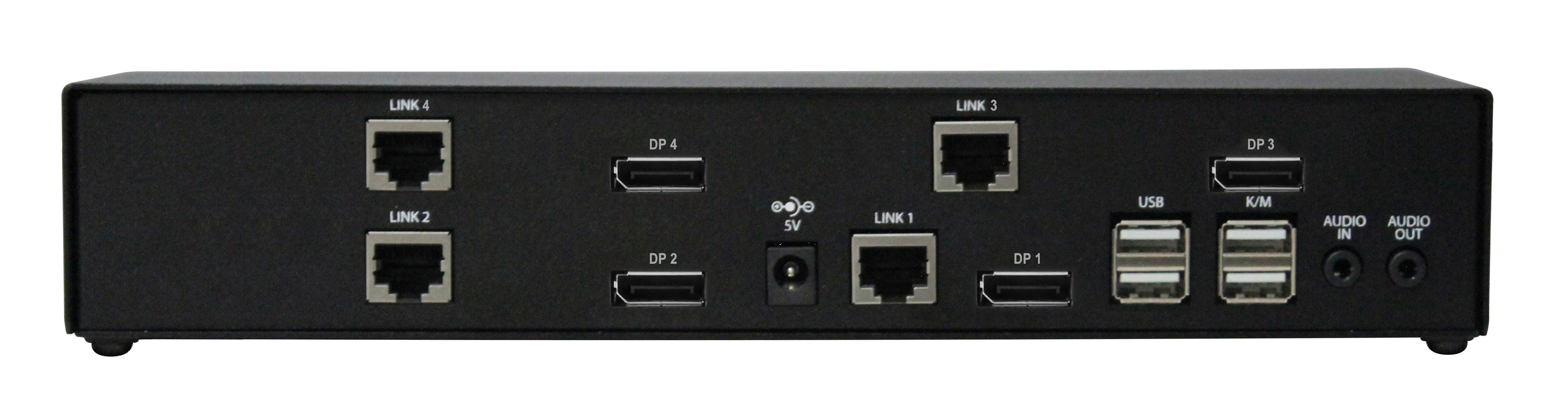 Quad-Head | DisplayPort | Full KVM extension | 3840×2160 | @30Hz | Bi-Directional Audio | 100 m (330 ft) over CAT5/5e/6