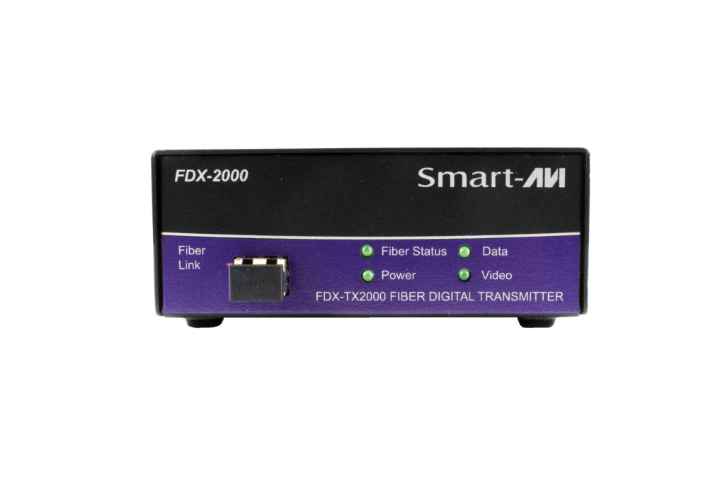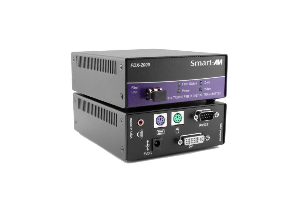 The FDX-2000 consists of a transmitter and receiver that extend KVM, DVI-D, audio and RS-232 signals. It is a professional quality KVM capable of extending signals up to 1,400 feet over a single multimode fiber optic cable.