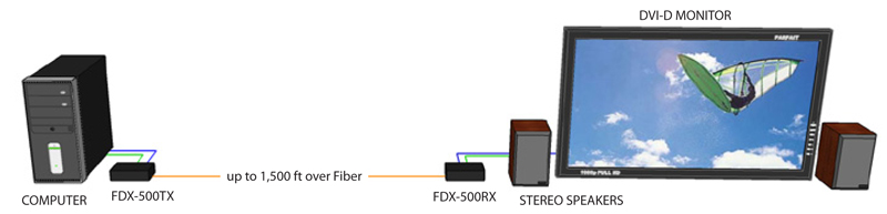 The FDX-500 is a perfect solution for extending the video and audio output of a computer in a remote location. It extends DVI-D and Stereo Audio to a remote location up to 1,500 feet away. The FDX-500 is immune to electromagnetic interference, making it ideal for use in situations where there is considerable interference. The FDX-500 is also very secure because it’s fiber optic signals cannot be easily tapped.