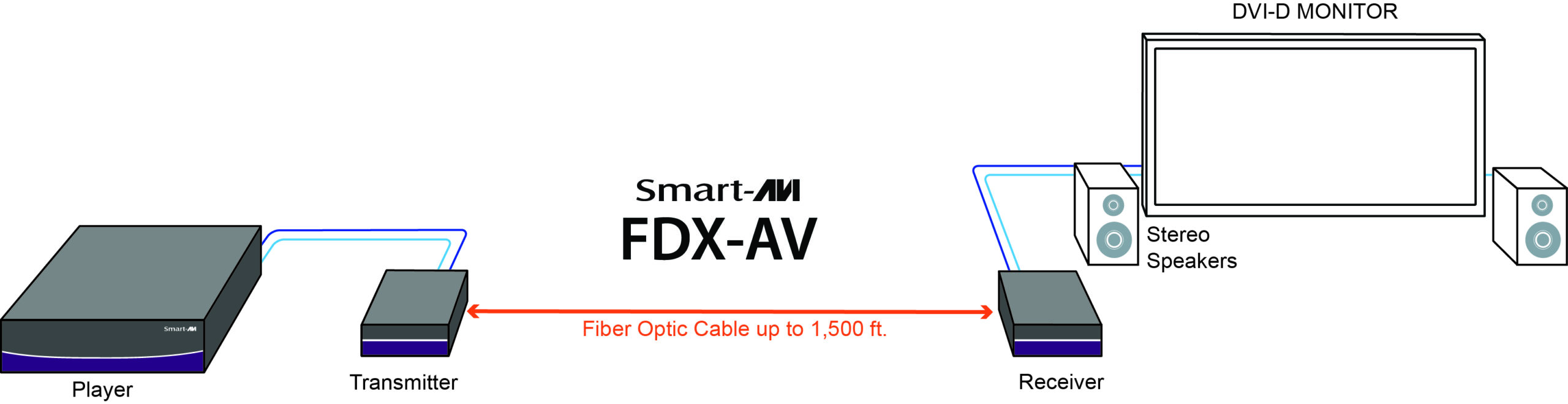 The FDX-AV consists of a transmitter and receiver that extend DVI-D, audio and RS-232 signals. Equipped with DVI-D connectors for multi-mode signals, this product is the perfect fiber solution for professional digital singage and multimedia presentation needs. It is capable of extending signals up to 1,500 feet over a single multimode fiber optic cable.
