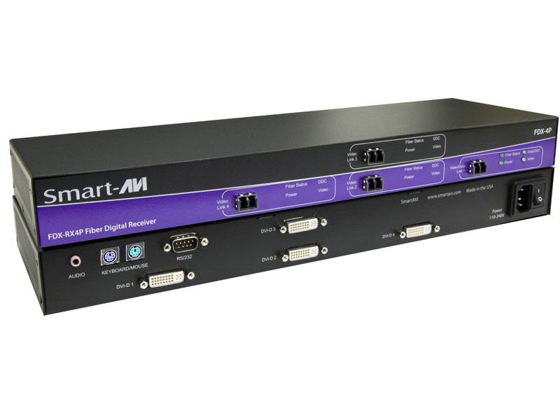 The SmartAVI FDX-M4P is capable of supporting four DVI-D monitors, with PS/2 keyboard and mouse, stereo audio with serial (RS-232) control. The system includes a transmitter and receiver, which are connected by four fiber optic cables. The transmitter connects to the user’s computer with the necessary cables, while the receiver connects to the remote interface devices up to 1,400 feet away.