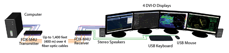 The SmartAVI FDX-M4U is capable of supporting four DVI-D monitors, with USB 1.1 keyboard and mouse, stereo audio with serial (RS-232) control. The system includes a transmitter and receiver, which are connected by four fiber optic cables. The transmitter connects to the user’s computer with the necessary cables, while the receiver connects to the remote interface devices up to 1,400 feet away.