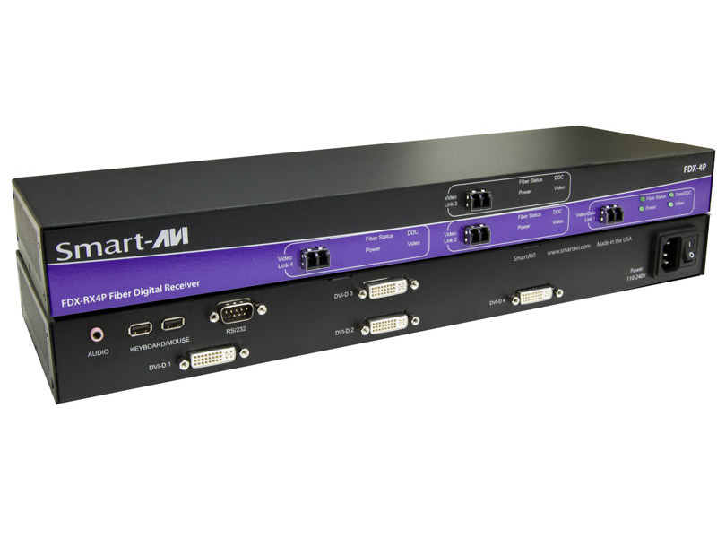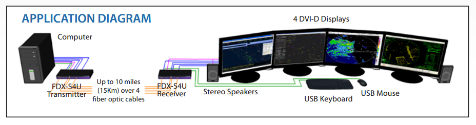 The FDX-S4U consists of a transmitter and receiver that extend four DVI-D outputs, with audio, USB keyboard and mouse, and RS-232 control. For exceptional quality and security, fiber optic extension is the best solution. The FDXS4U can go the distance with single-mode fiber optic cabling with a reach of up to 9 miles.
