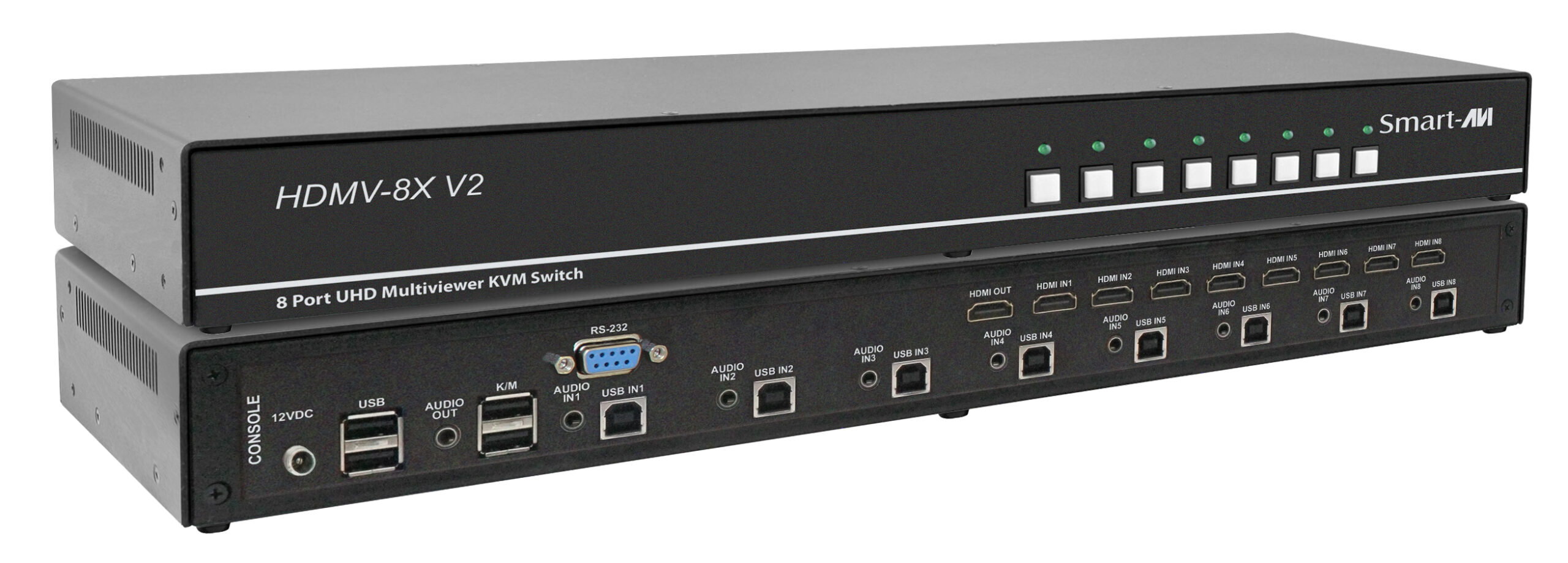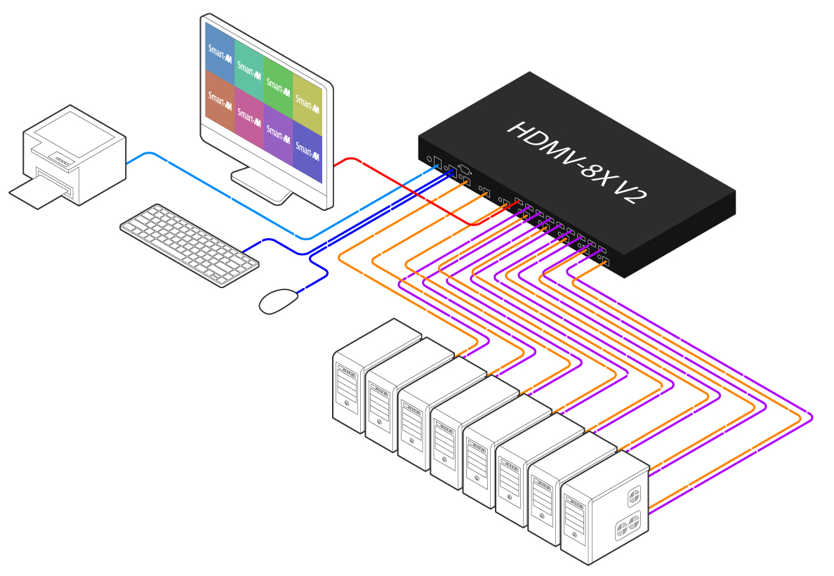 HDMV-8X V2 is a powerful 8-Port HDMI Multiviewer and KVM Switch that allows users to monitor and control up to 8 computers simultaneously on a single display. With ultra-clear 4K output, seamless switching, and a variety of multiview modes, the HDMV-8X V2 is ideal for control rooms, command centers, and high-density workstation environments.