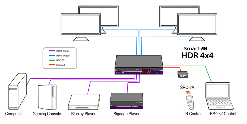 The HDR 4X4 works with HD-DVD players, TiVo systems, PCs, and satellite set top boxes that connect to an HDMI display. The main function of a matrix switcher is to allow any 4 inputs to be routed to any 4 outputs; or the same input to be routed to all outputs, or any combination.