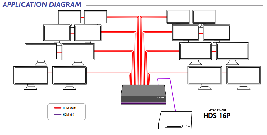 - One HDMI 1.4 input signal split to 16 HDMI 1.4 sink devices
