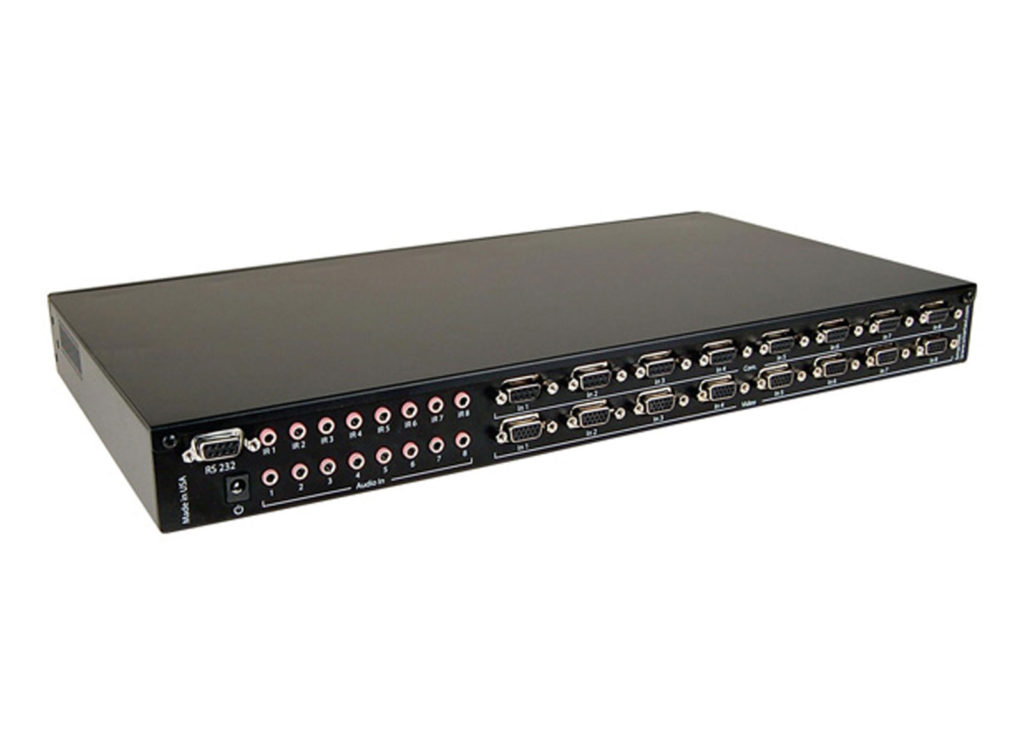Discontinued. 8×8 VGA, Component AV, stereo audio, IR, and RS-232 signal matrix with enhanced range up to 1,799 feet via CAT5 cabling.