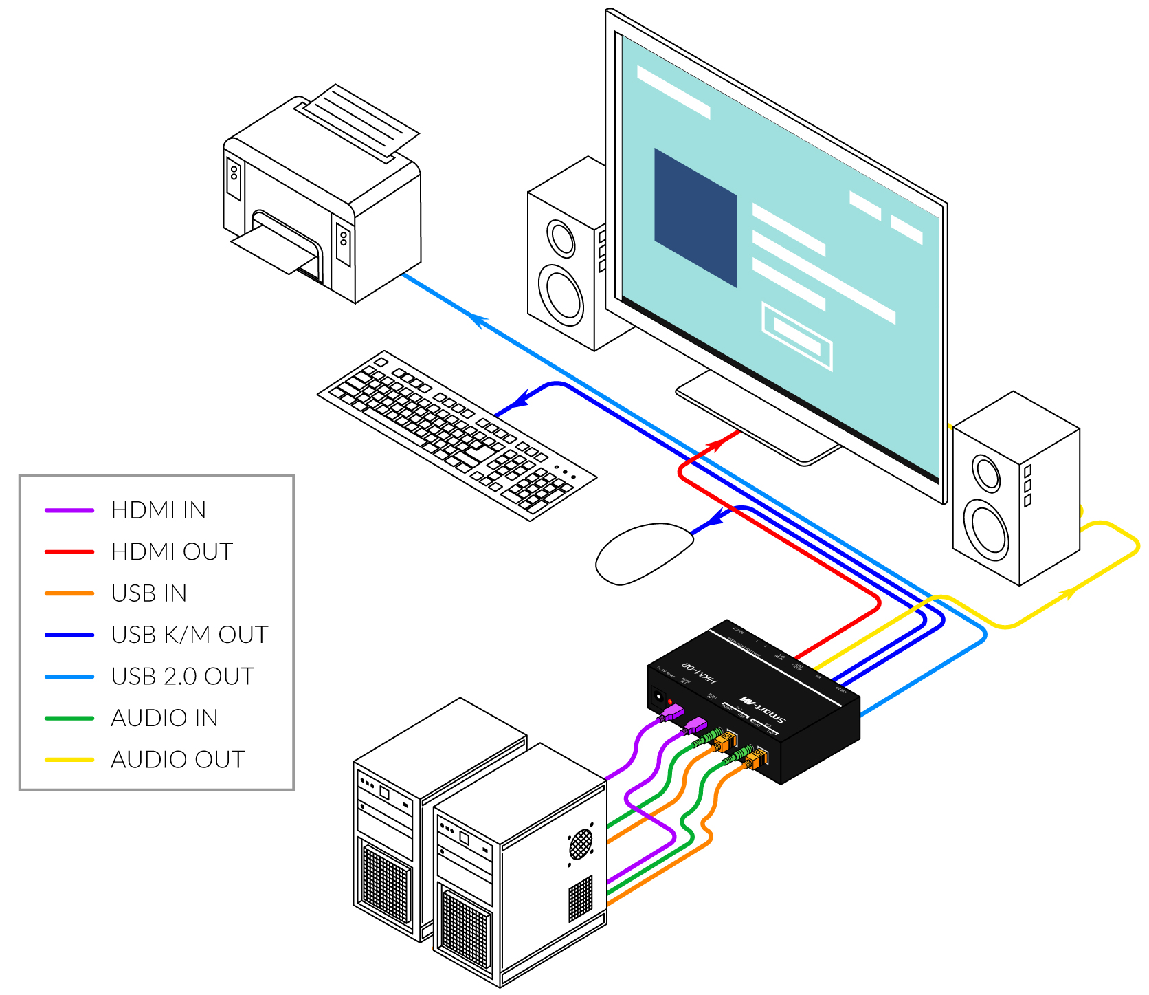 The HKM-02 is a dedicated multi-platform KVM Switch capable of managing up to 2 different computers through a single monitor, USB keyboard and mouse, a set of speakers and USB devices like printers, memory devices, scanners, etc.
