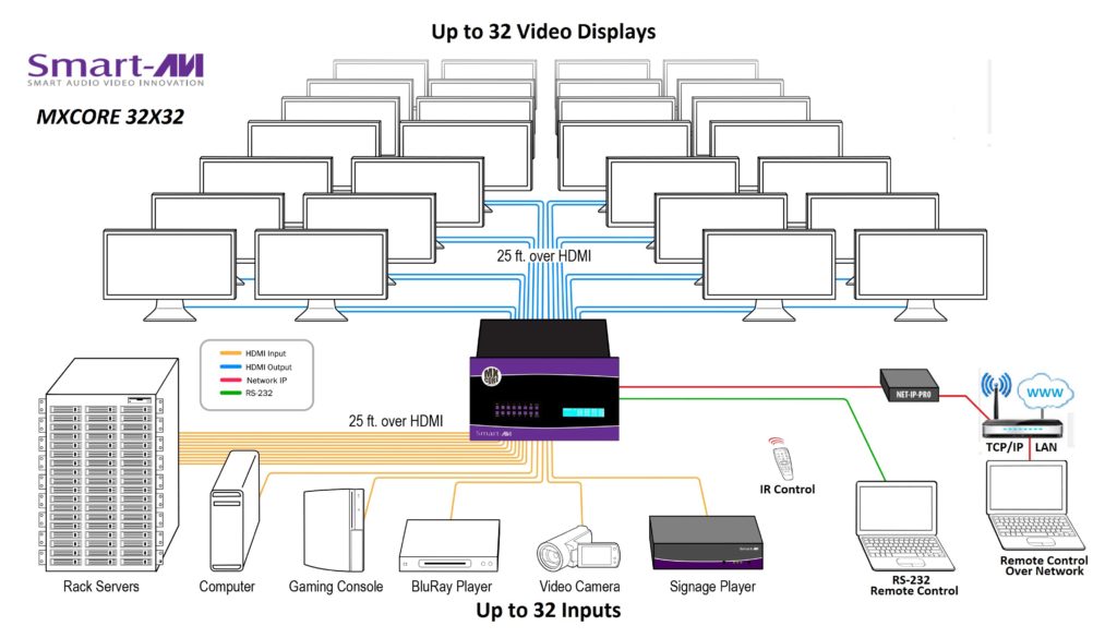 - Switches any HDMI source input to any output up to 32×32