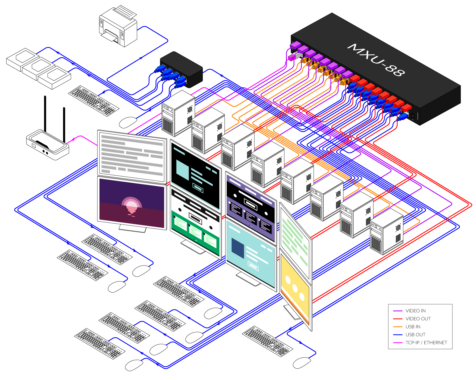 The MXU-88 is a 8X8 HDMI & USB 2.0 matrix switch: it lets up to eight users easily access & control eight remote computers and USB 2.0 devices from eight workstations, each equipped transparent USB peripherals like keyboards and mice, as well as 4K-compatible HDMI monitors.