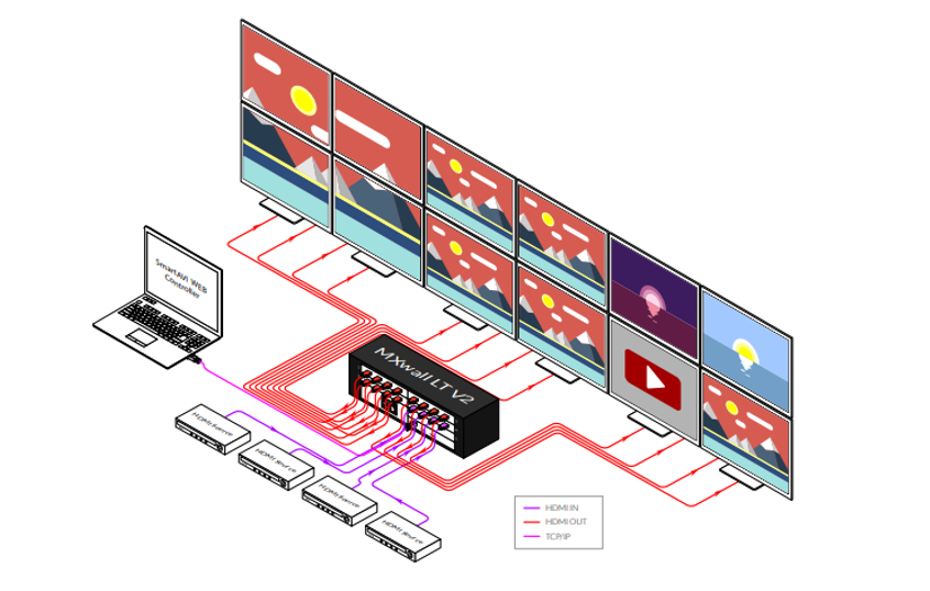 The MXwall LT V2 is a video wall processor and matrix switch with up to 12 HDMI outputs. Compact, plug-and-play, and excellent for mid-sized video wall displays between 4-12 screens with resolutions up to 1080p (1920×1080 @ 60Hz) Full HD.