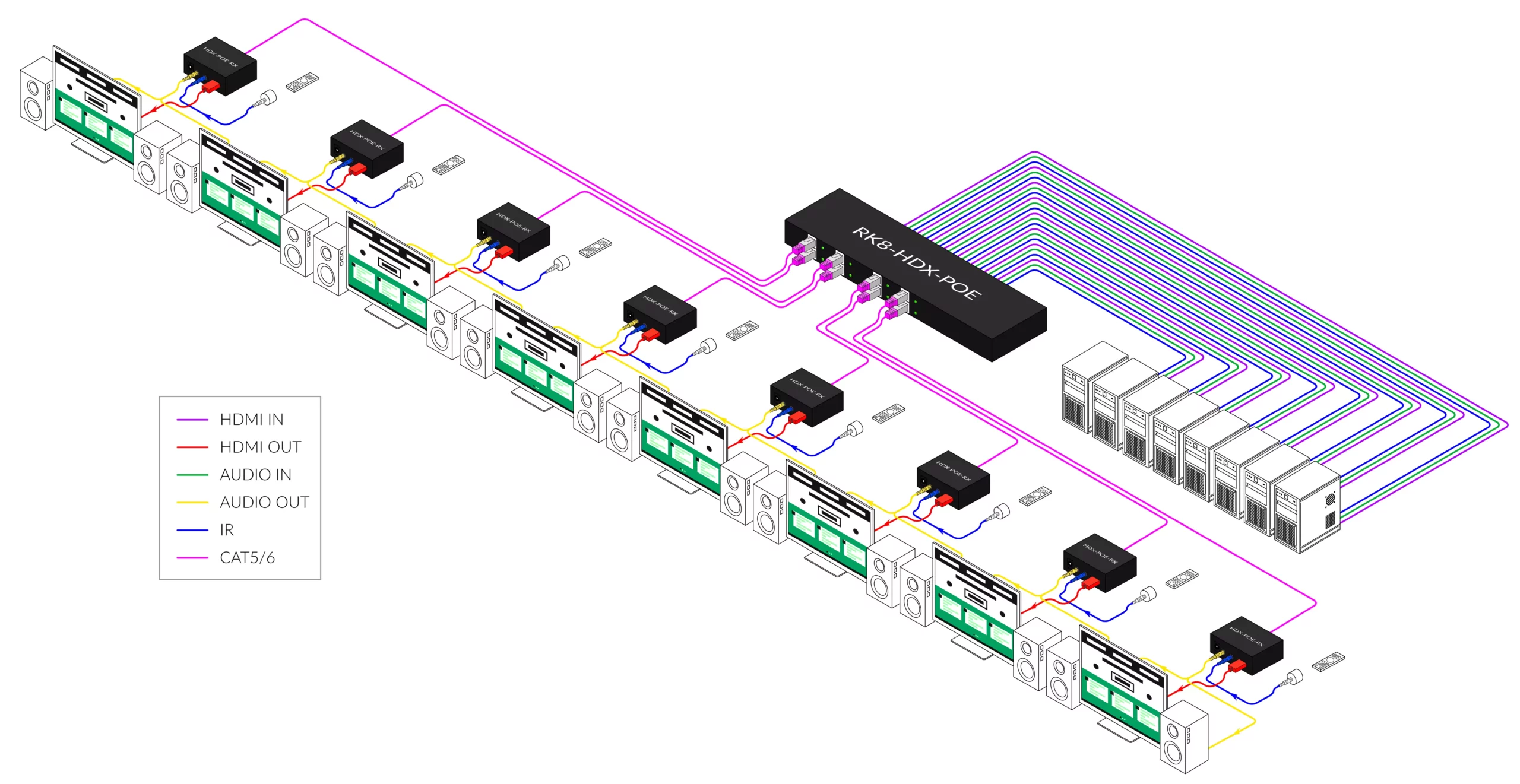 DIGITAL SIGNAGE – When it comes to digital signage, the RK8-HDX-POE is an excellent deployment option. With the RK8-HDX-POE, up to eight digital signage devices can be centralized and secured from public access.