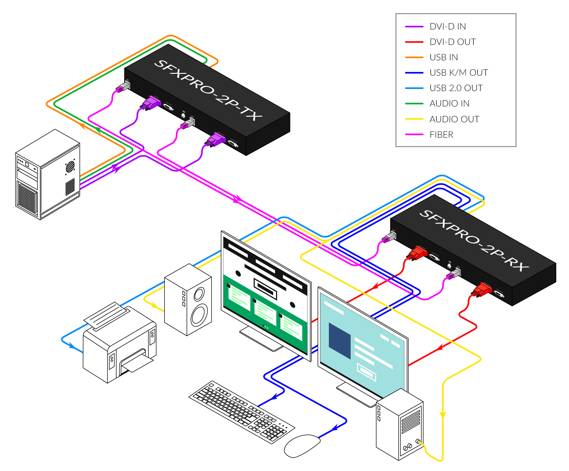 The SFXPRO-2P is a perfect solution for extending two DVI-D and USB 2.0 signals from a computer in a remote location up to 1,500 feet away. It supports high-resolution DVI-D video and all USB device types from high-speed web cams, hard drives, printers, scanners, audio devices, touch screens, digital cameras and game controllers. The SFXPRO-2P is immune to electromagnetic interference, making it ideal for use in situations where there is considerable interference.
