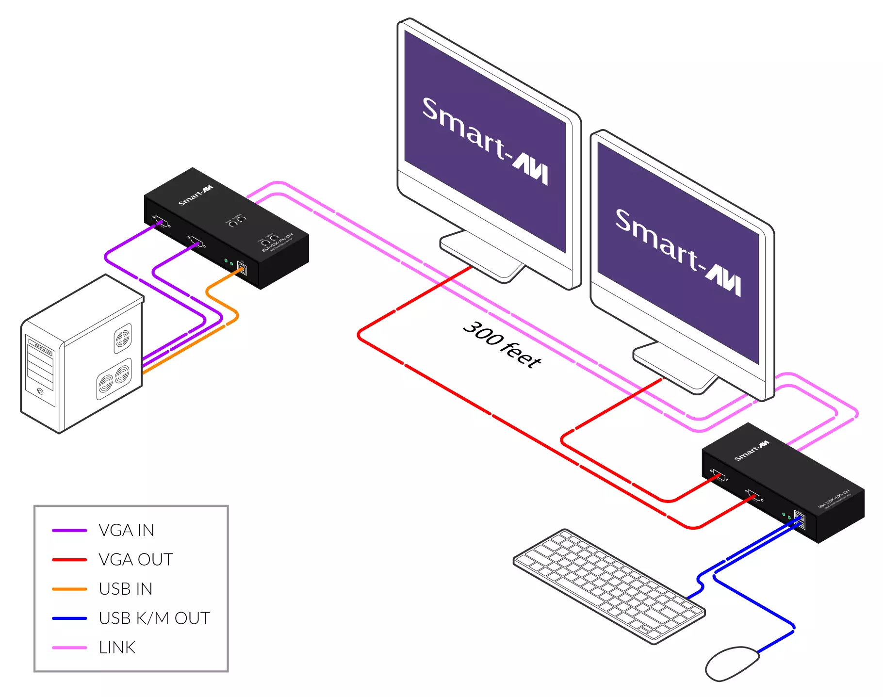 The SM-VDX-100-DH is a Dual Head VGA (1920×1200) and USB keyboard-mouse extender, sending signals up to 300 ft (91 m) away over two conventional and inexpensive CAT5/5e/6 cables.