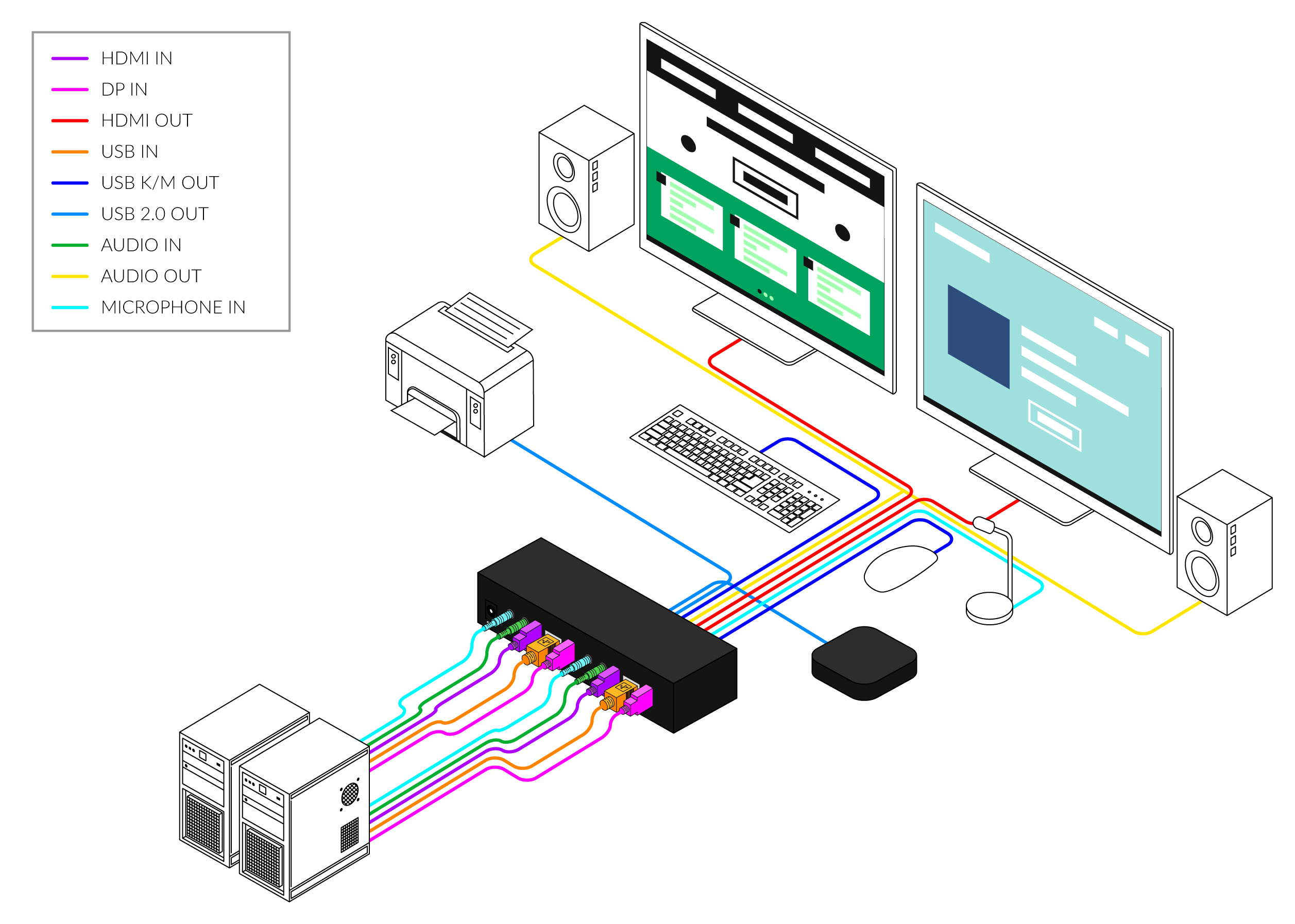 The SM3-UHX-2D KVM Switch allows the control of two computers with 4K dual HDMI video output via a single console set of USB keyboard/mouse/hub, microphone, speaker and display. Has a built-in USB 3.2 gen 1 compliant and 3.5mm mini stereo ports allow sharing of the USB keyboard/mouse/hub, speaker, and microphone among the connected computers.