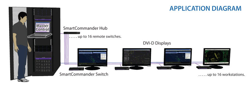 The SmartCommander system brings the control of a matrix switch to remote workstations, eliminating the need to control the switch locally. Each workstation is equipped with a simple switch panel, allowing the user to select the desired output with the press of a button. The system also allows for a master to control the switching functions, overriding the remote control if necessary. The SmartCommander system can be used with any of SmartAVI’s RS-232 compliant matrix switches.