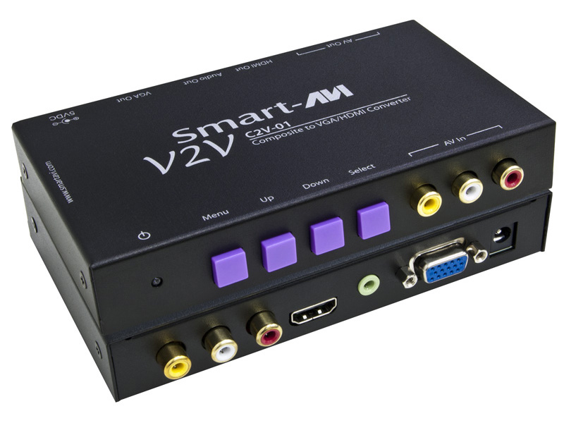 The V2V-C2V-01 Converts Composite Video to VGA with HDMI Output and Stereo Audio. The unit also has composite outputs for other composite devices.