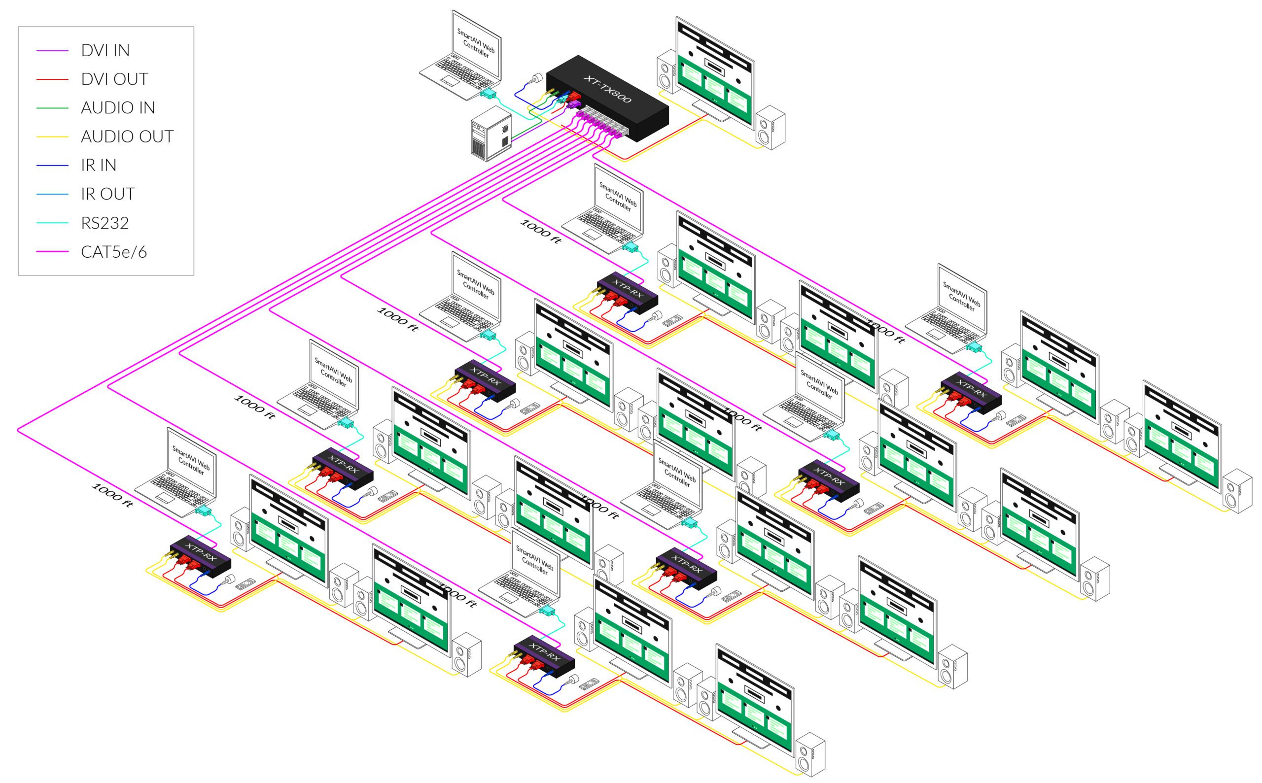 Use a single CAT5 cable to broadcast high-resolution SXGA, stereo audio, RS-232 and IR signals up to 8 locations, up to 1,000 feet away.